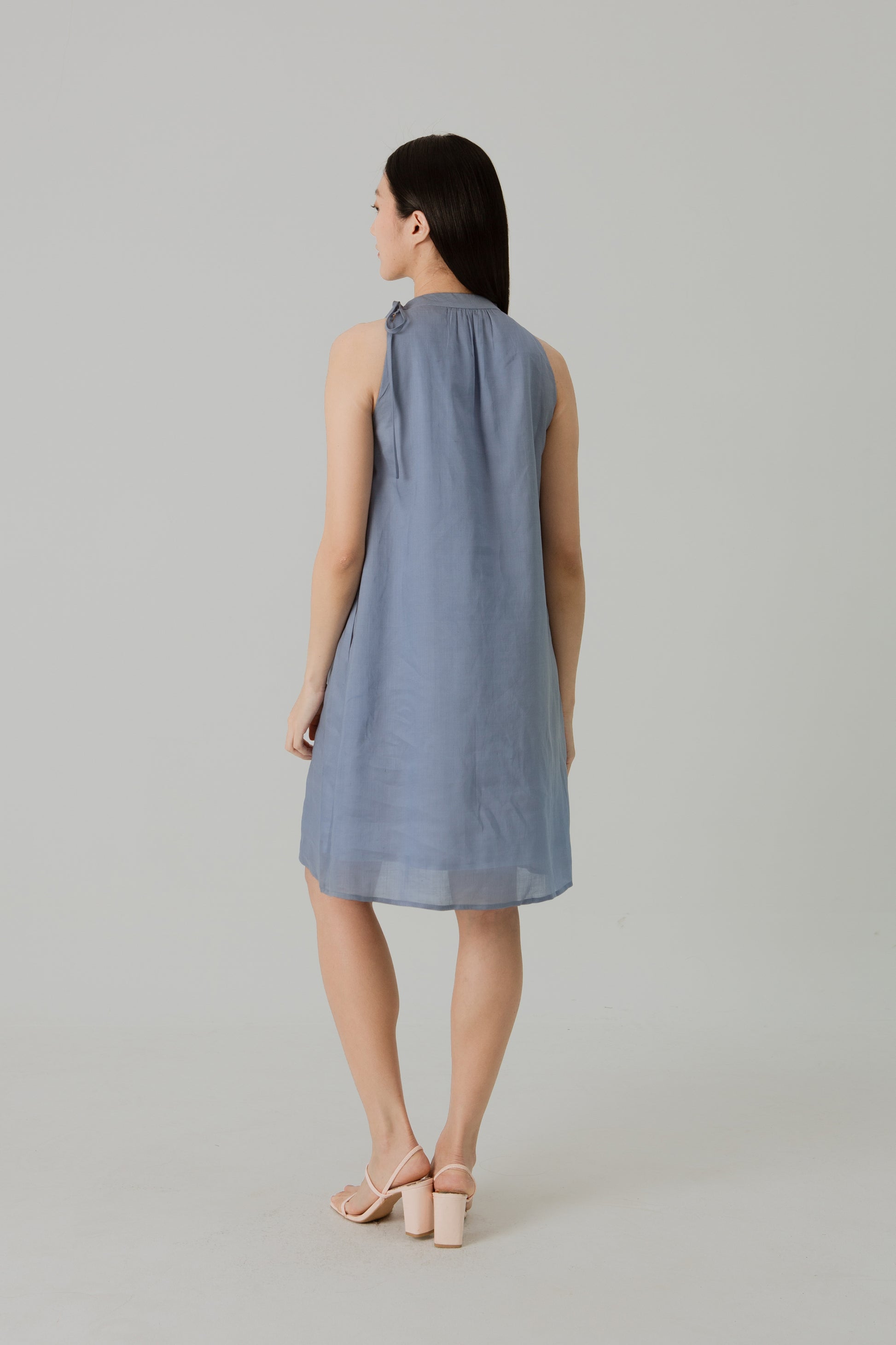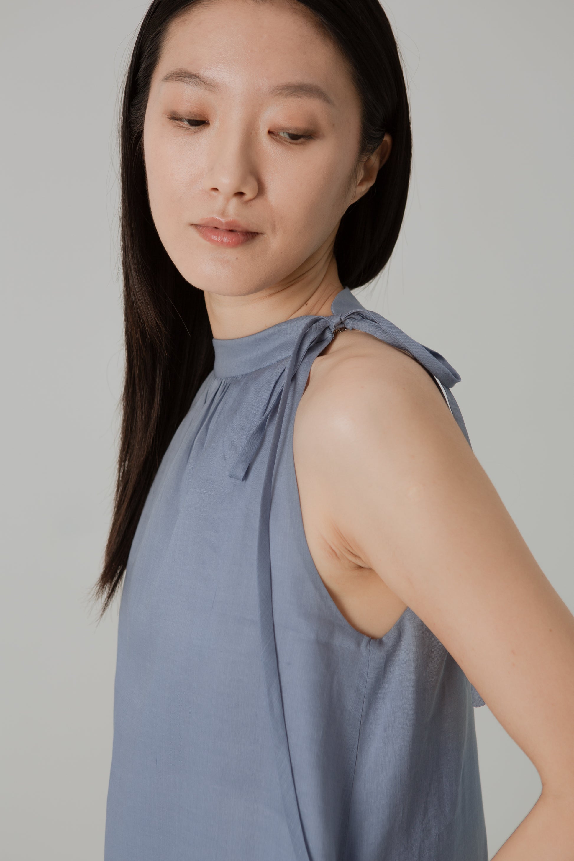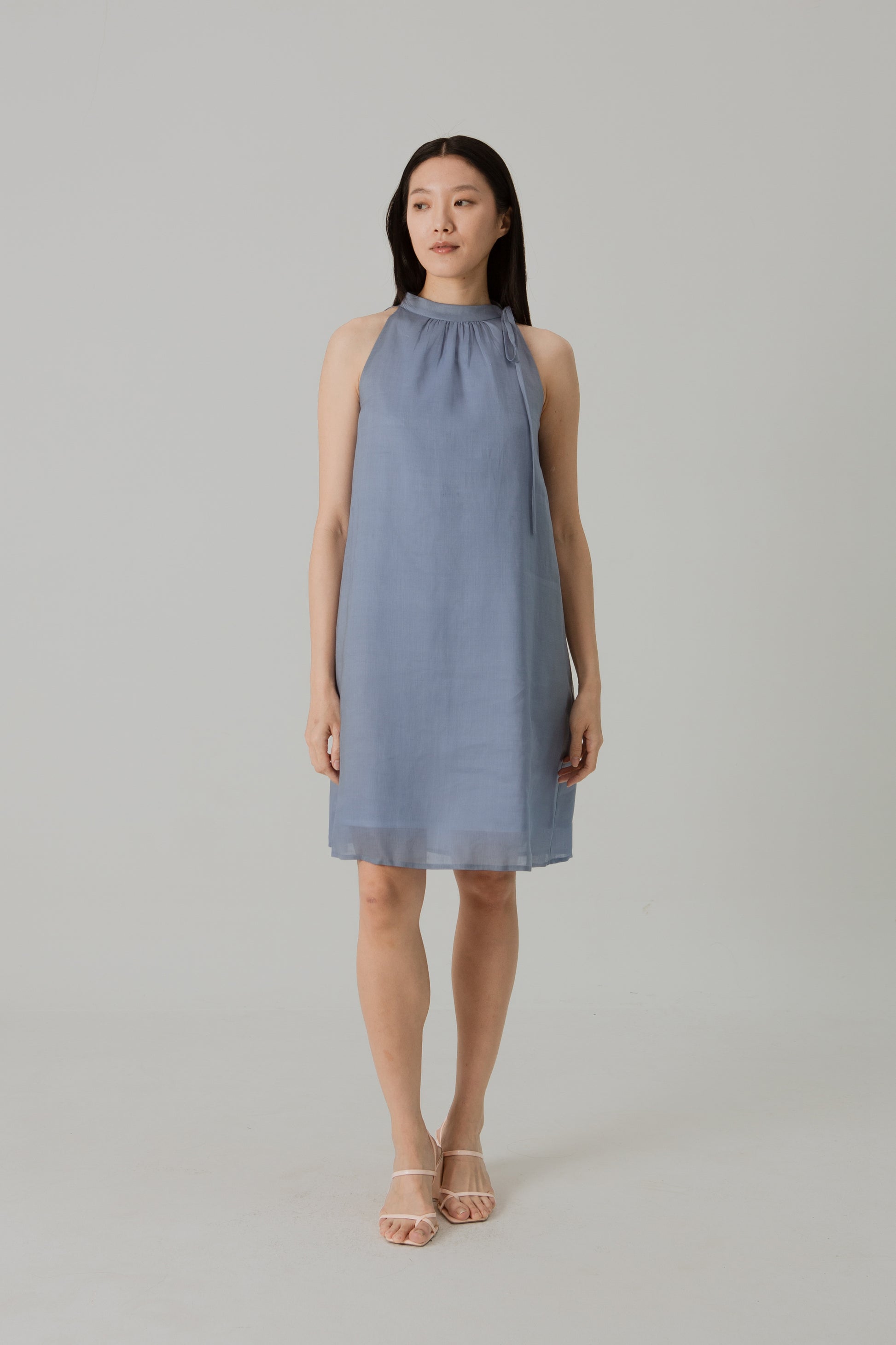 The stand collar fastens at the side of the neck with a tie-ribbon detail, while soft gathers at the neckline introduce gentle volume. Designed to fall above the knee, this piece moves easily from day to evening.