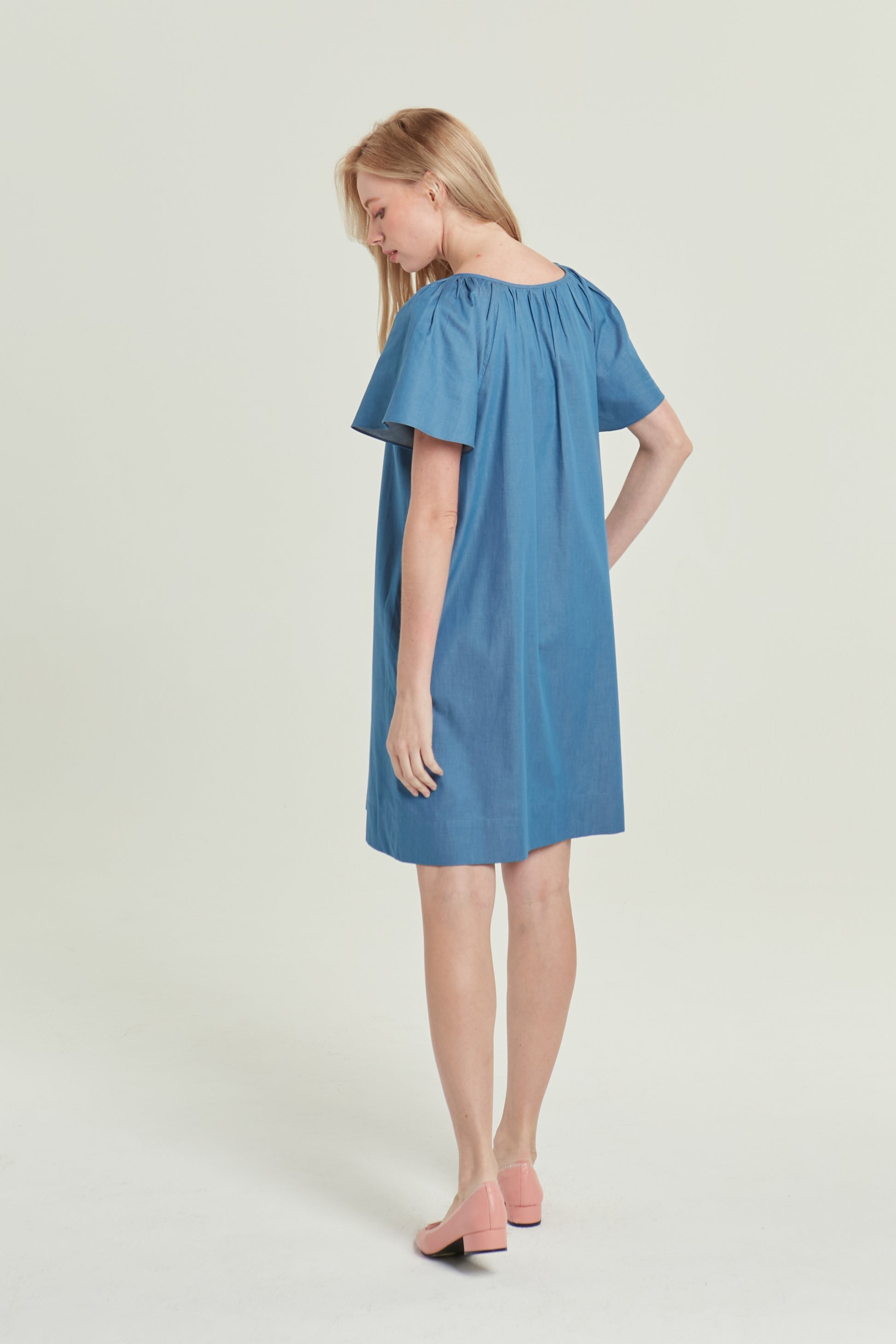 An easy tent dress you can slip on any day of the week. Crafted from lightweight Japanese cotton denim, it falls with soft gathers through the front and back, creating a relaxed, feminine shape. A slender tie ribbon at the neckline adds a quiet touch of detail, framed by flutter sleeves. Light and breathable, it’s fully lined in delicate cotton voile for all-day comfort. Echoing the ease of our Weekend Blouses, this is for those who want a slip-on-and-go alternative.