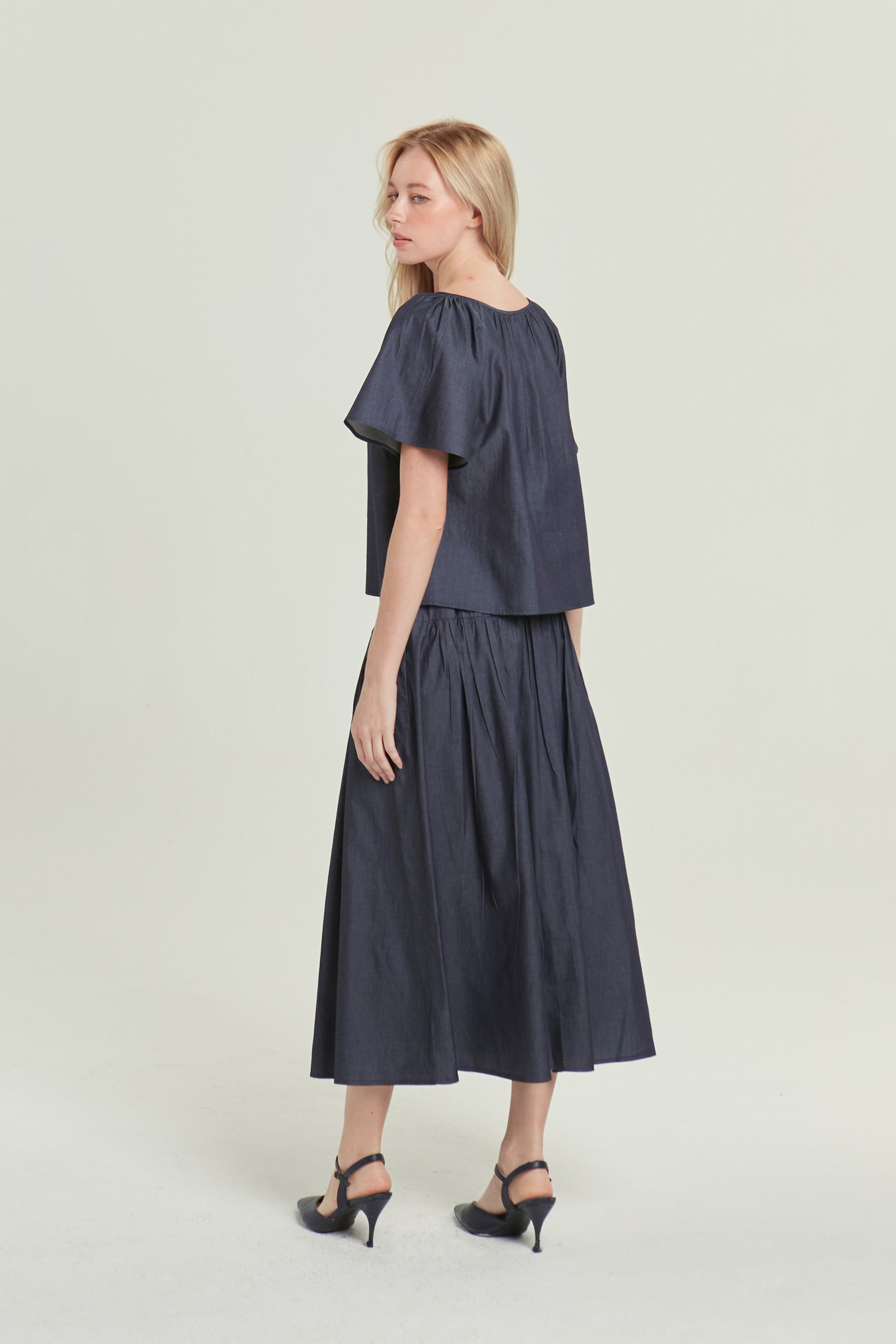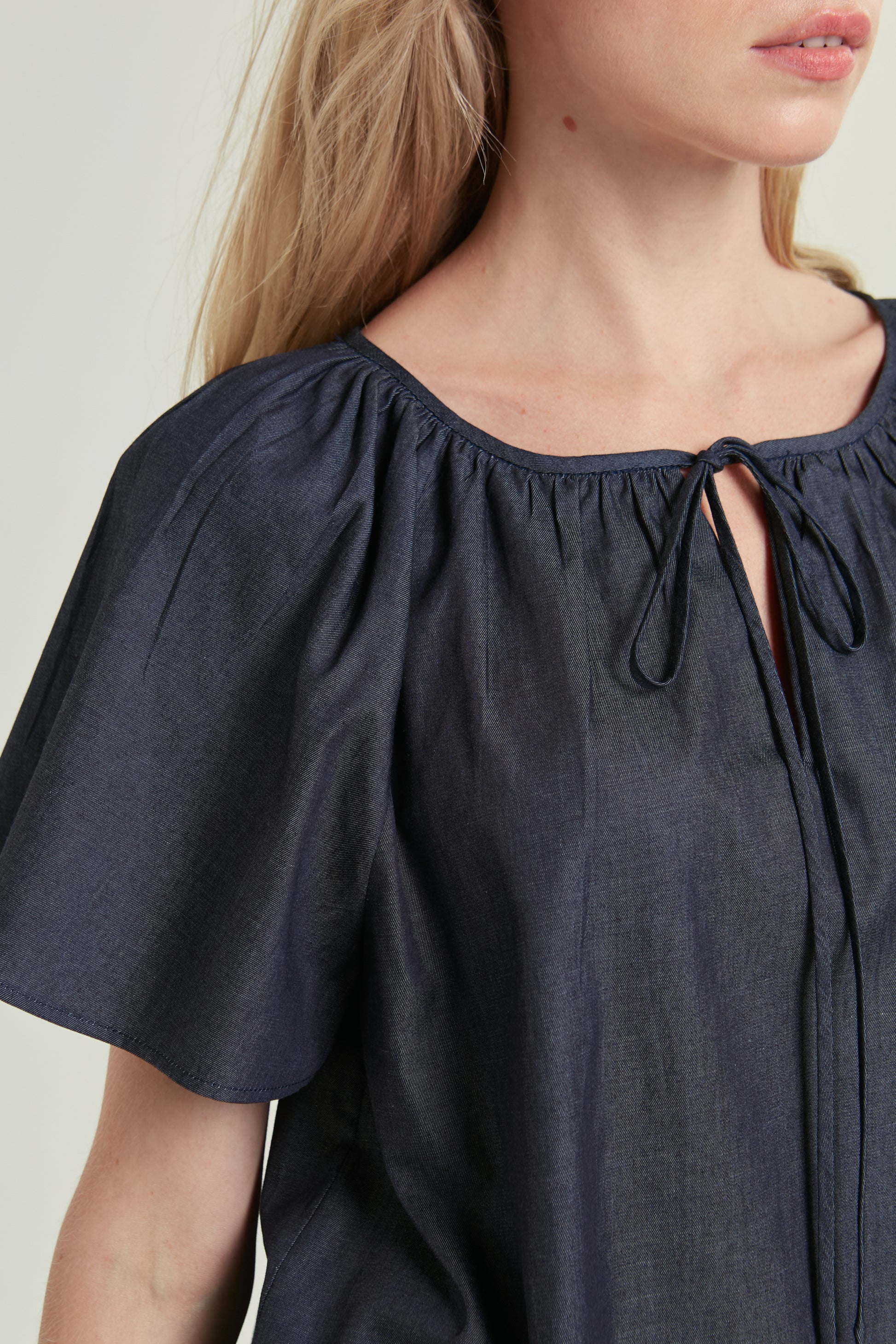 A relaxed blouse cut from soft and gentle denim made from 100% Japanese Cotton. It falls with soft gathers through the front and back, creating a relaxed, feminine shape. A slender tie ribbon at the neckline adds a quiet touch of detail, framed by flutter sleeves. An easy piece to slip on and go about the week. If you've loved our Weekend Blouses, this is one you'll definitely want to add to the collection.