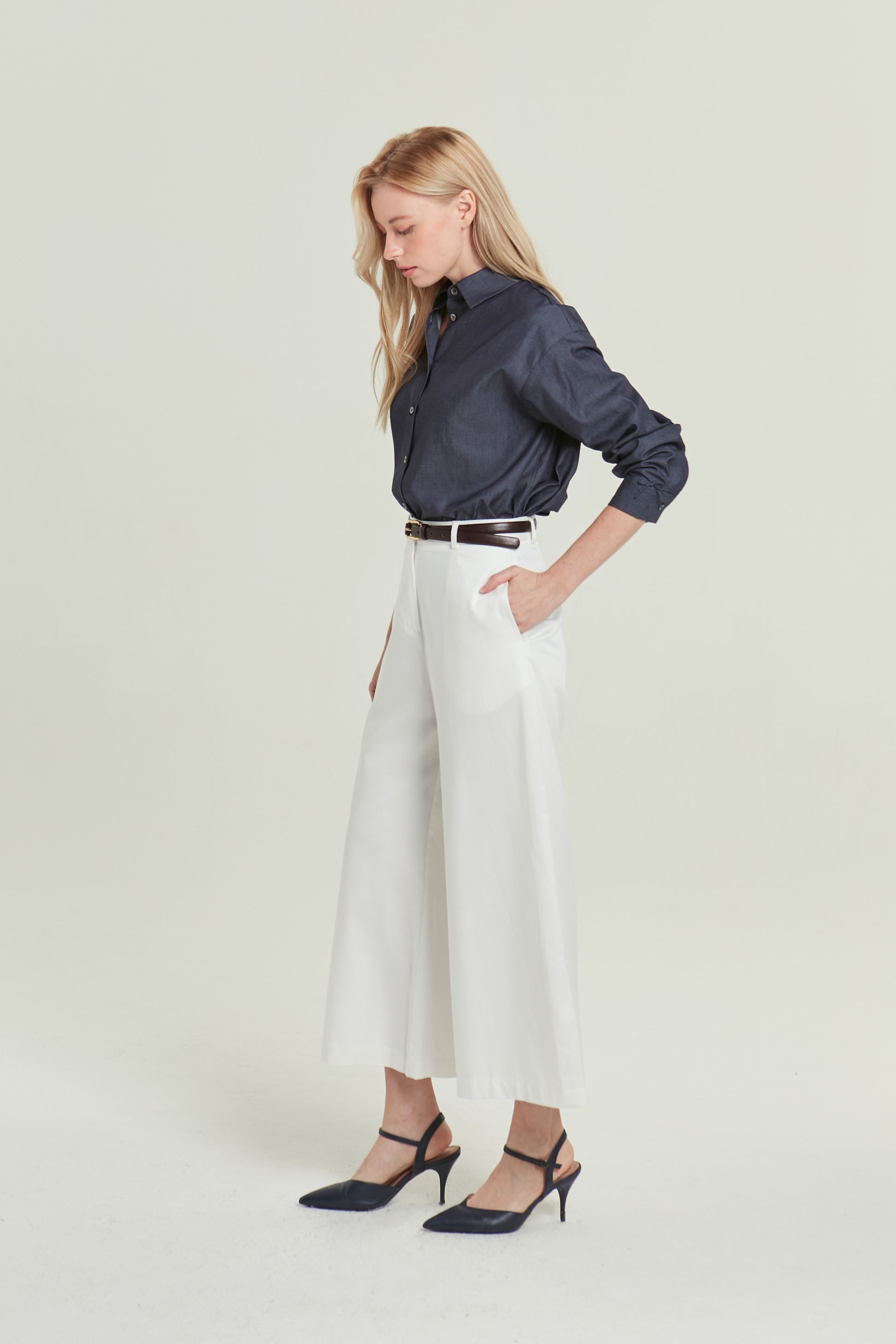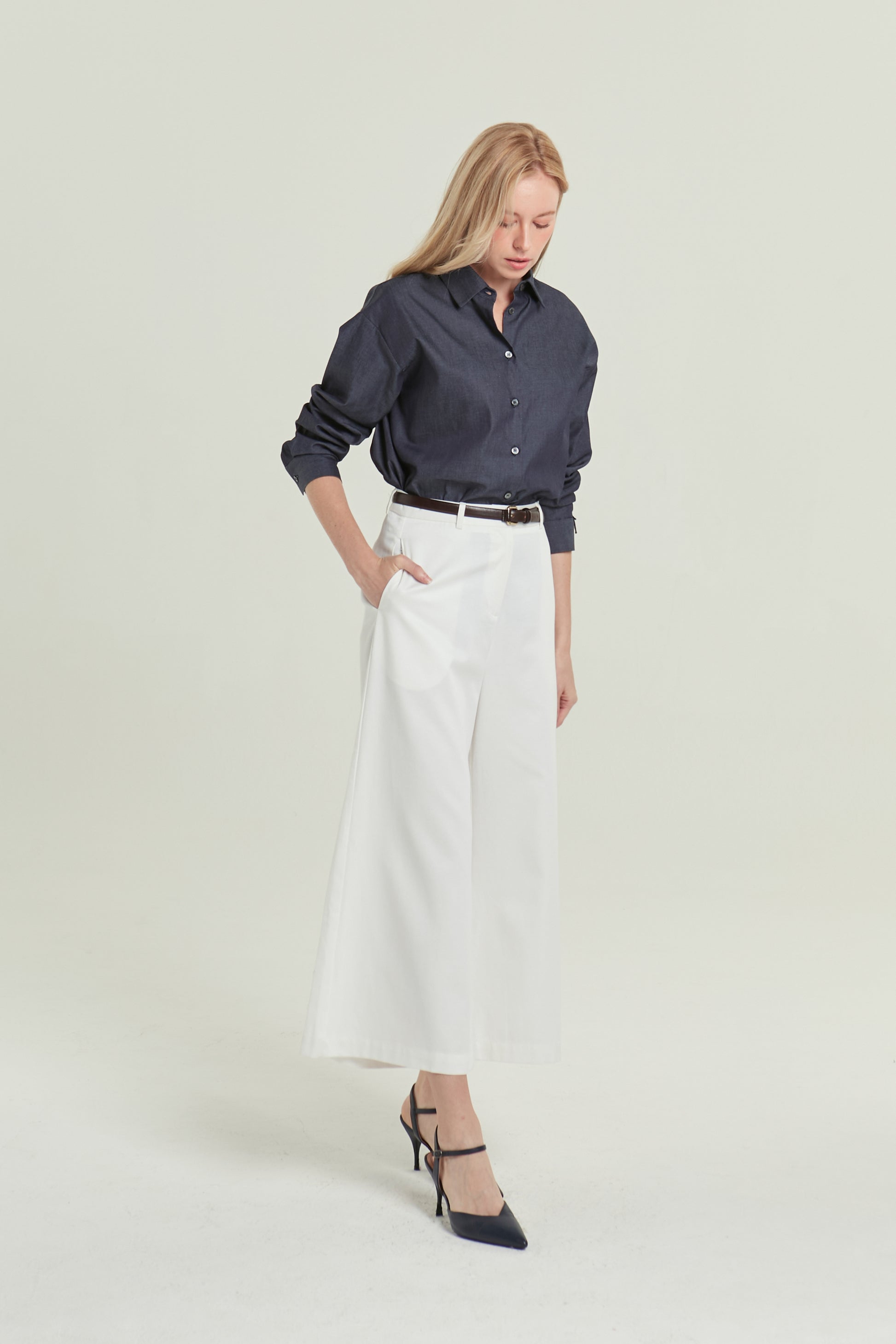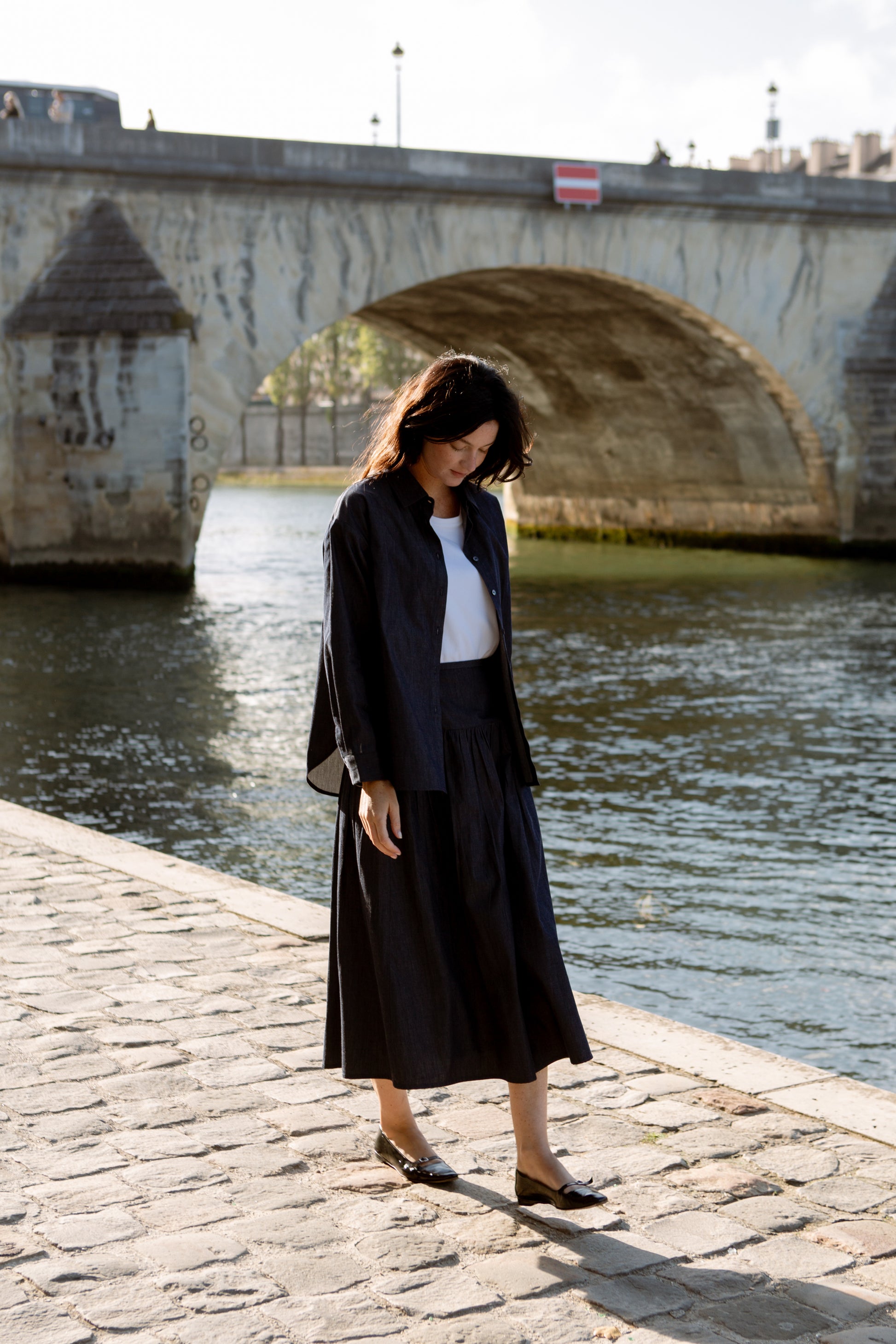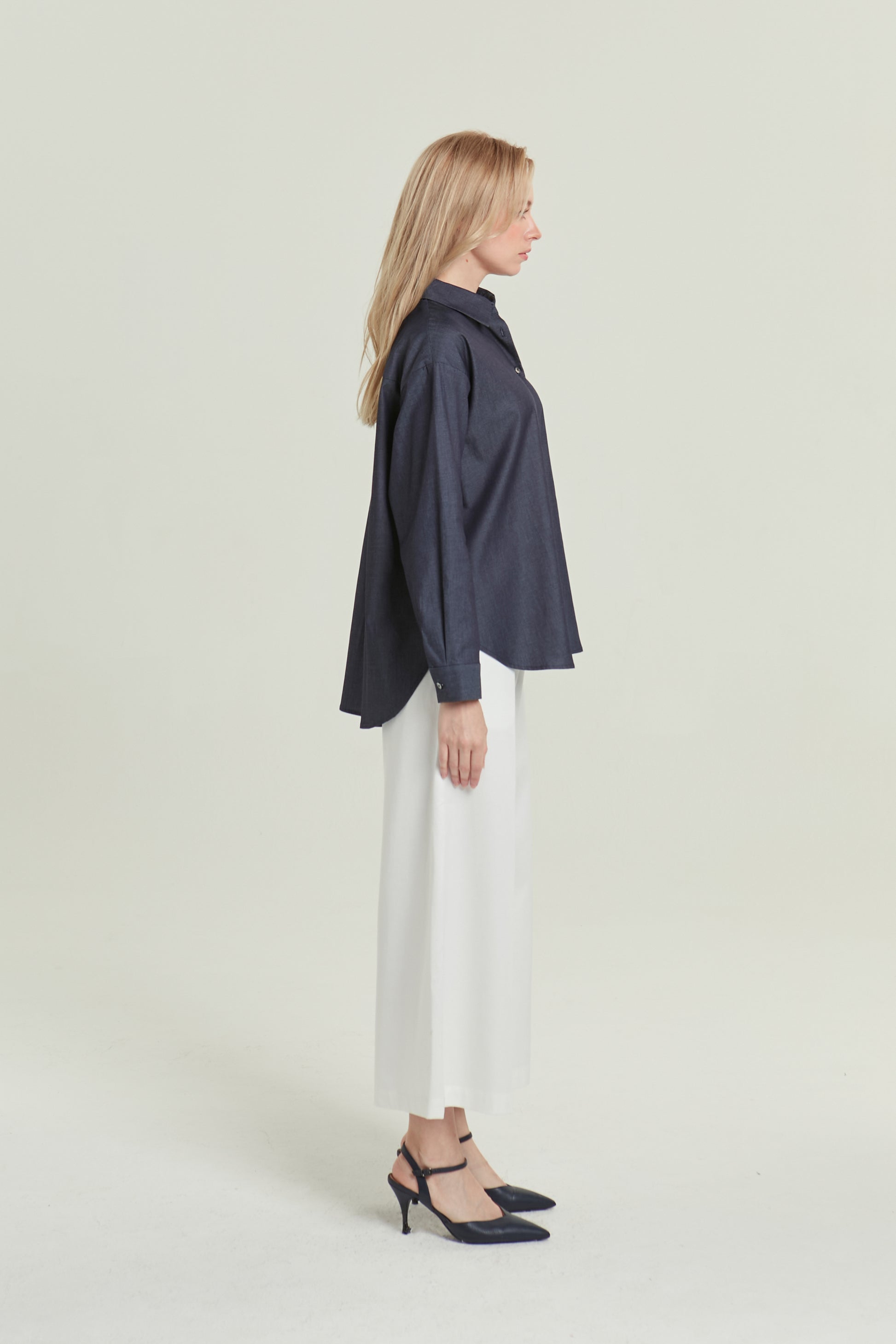 A revisit of our well-loved Everyday Shirt, now in soft and gentle Japanese cotton denim. The fabric feels smooth against the skin and holds its shape well, adding quiet structure to the gently oversized silhouette. Finished with a curved hem and signature ribbon detail at the cuff, it’s perfect worn on its own or layered with ease.